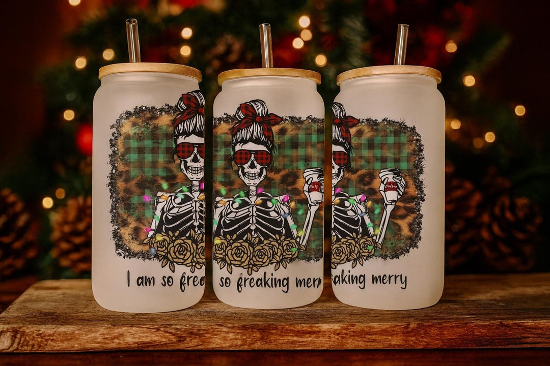 Funny Skeleton Christmas Glass Can, I Am So Freaking Merry Frosted Tumbler, Holiday Leopard Plaid Cup with Bamboo Lid