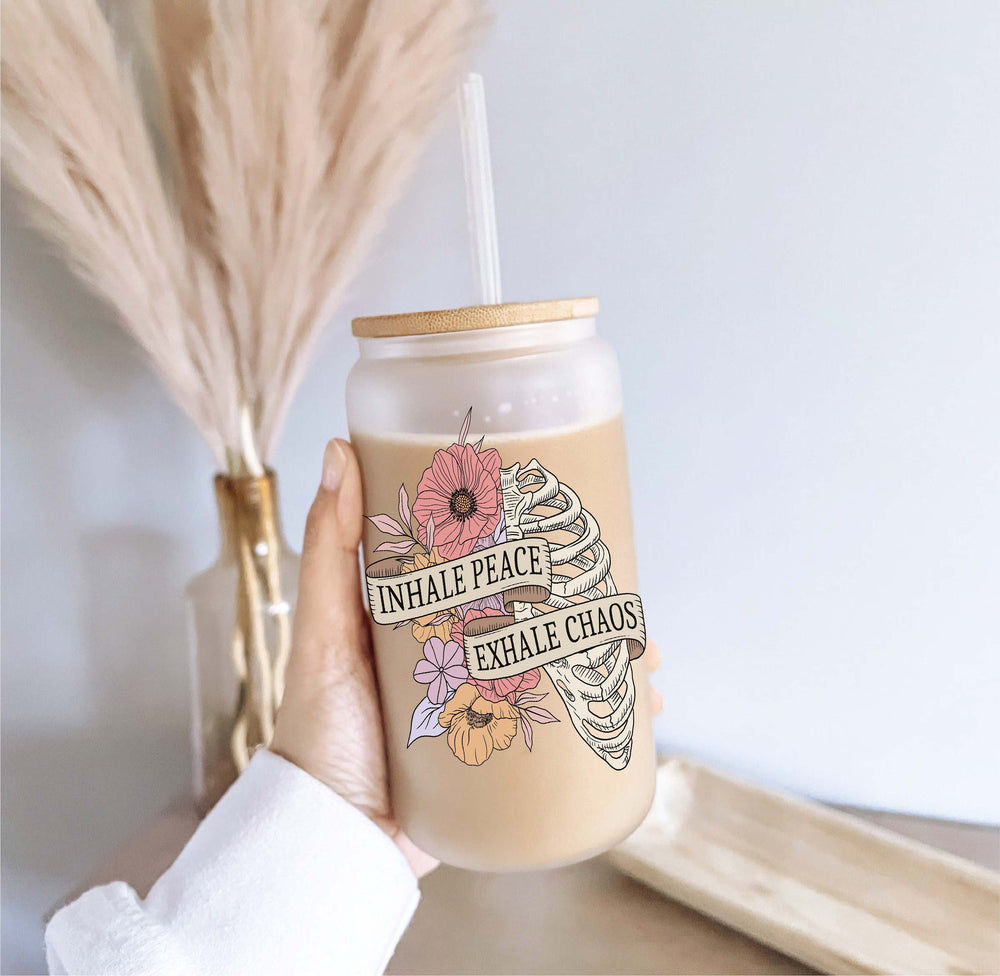 Inhale Peace Exhale Chaos Iced Coffee Glass Cup With Lid