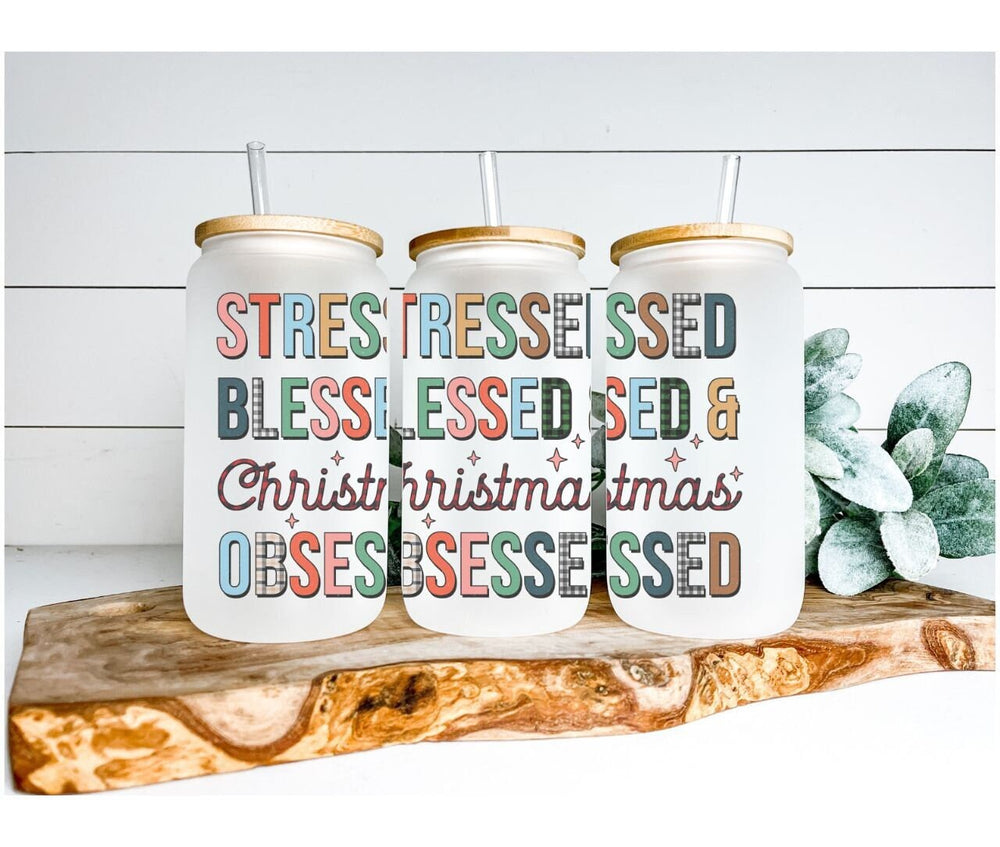 Stressed Blessed Christmas Obsessed Frosted Glass Can | Funny Holiday Iced Coffee Cup | Cute Xmas Gift for Women or Coworkers
