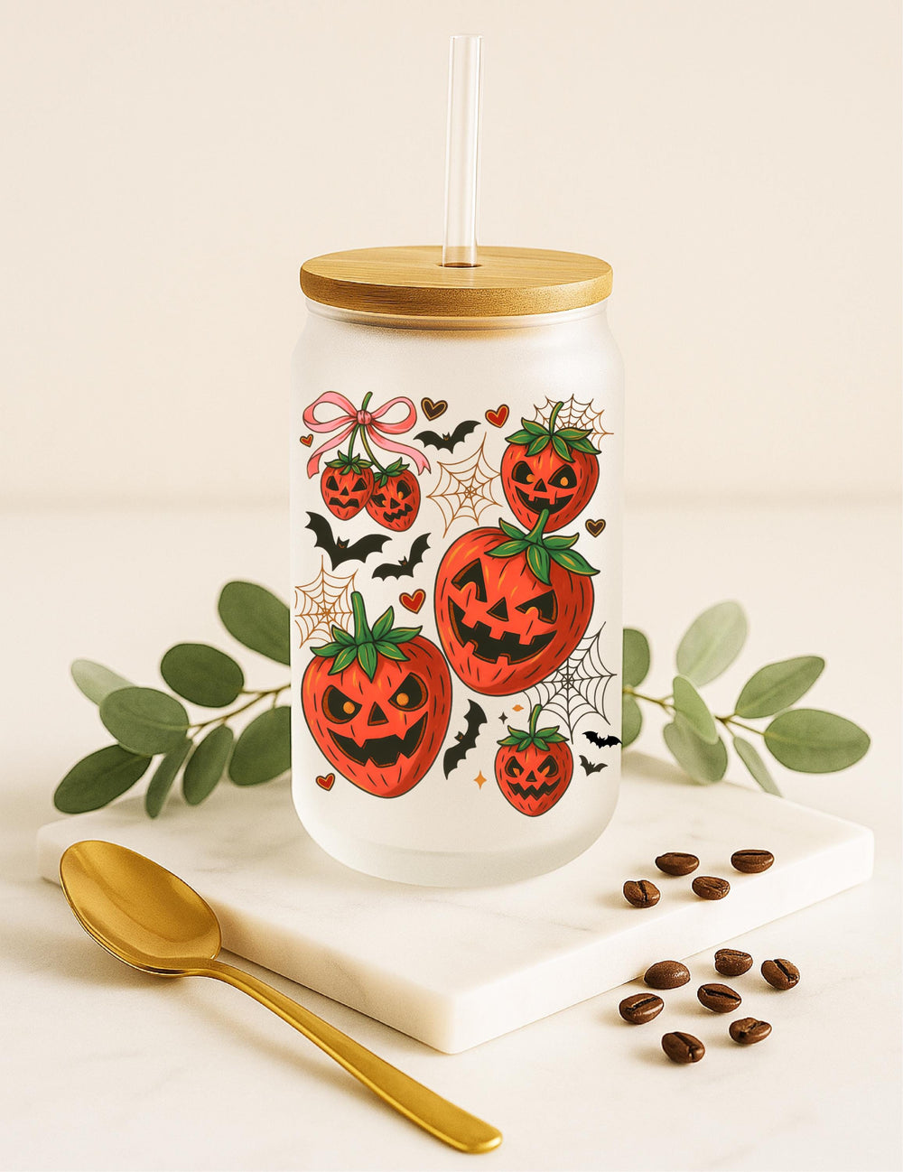 Strawberry Jack-O’-Lantern Design, Cute Spooky Iced Coffee Tumbler Gift