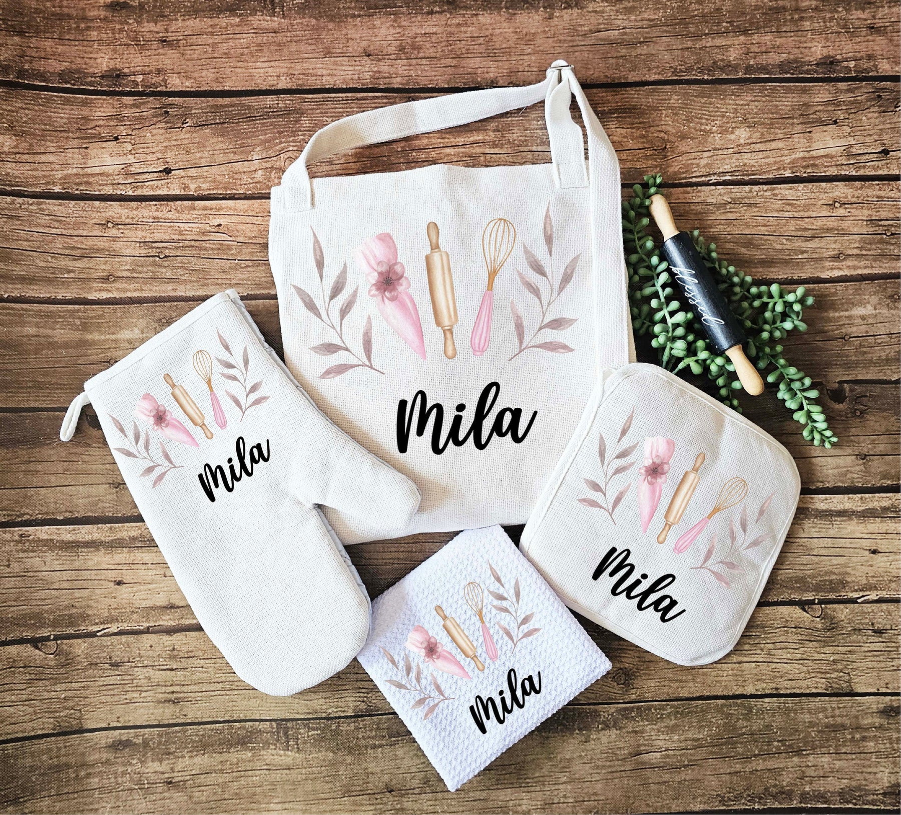 • Complete Kitchen Set: This set includes a personalized apron, custom oven mitts, potholder, and dish towel, making it a perfect all-in-one kitchen gift.