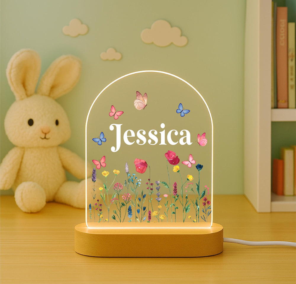 Personalized Butterfly Meadow Night Light – Custom Name Floral LED Lamp, Woodland Bedroom Decor, Birthday or Nursery Gift