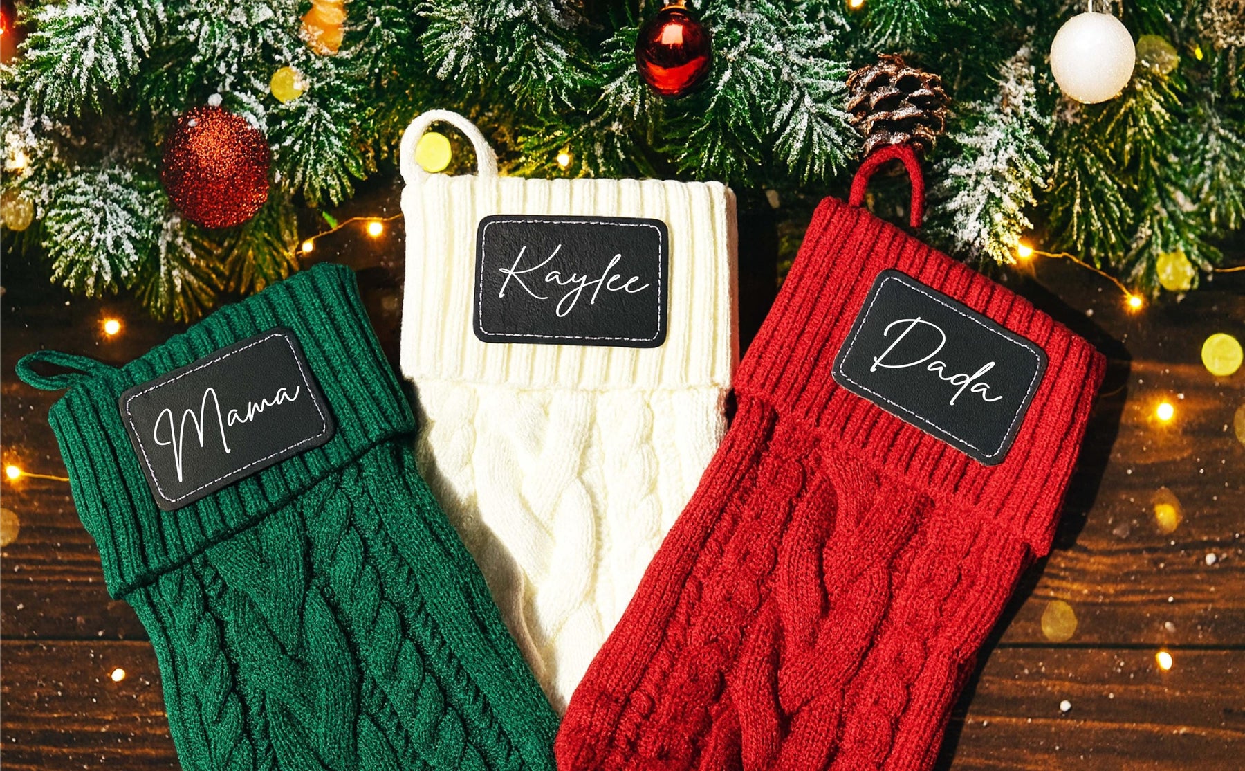 Personalized Christmas Stockings Family stockings Knitted Stocking with leather patch Custom Stocking with Name Holiday Stockings Gift