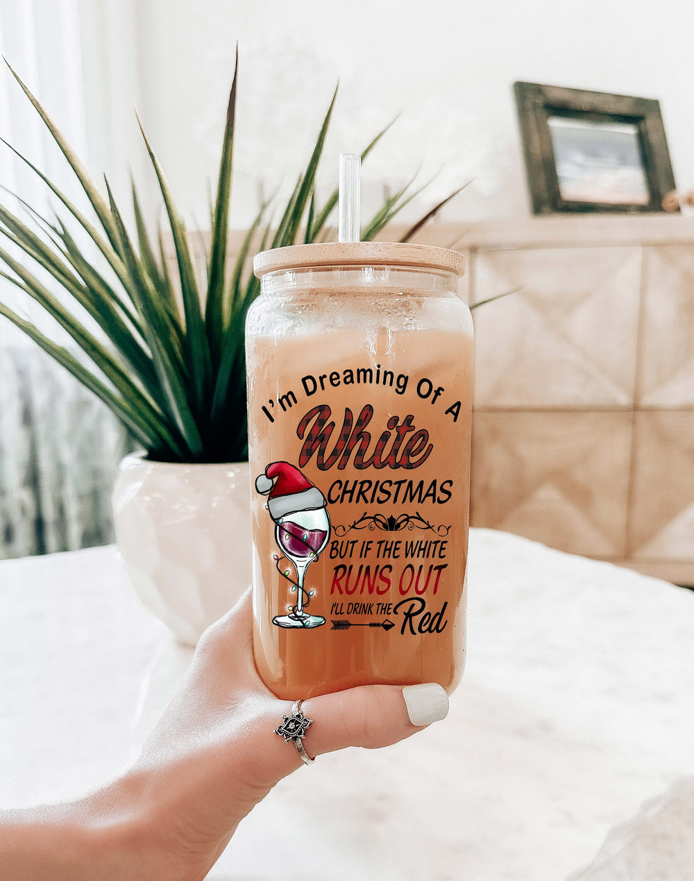 Introducing the Dreaming white Christmas is here Iced coffee glass cup with lid and straw Holiday coffee glass Holiday iced coffee cups Funny Christmas cup, the perfect festive companion for your favorite beverages this holiday season. This charming 16oz glass tumbler is designed to elevate your sipping experience, whether you're enjoying a chilled iced coffee, a fizzy soda, or any refreshing drink. With its stunning glass construction, you’ll appreciate both the aesthetics and functionality of this delightful cup.