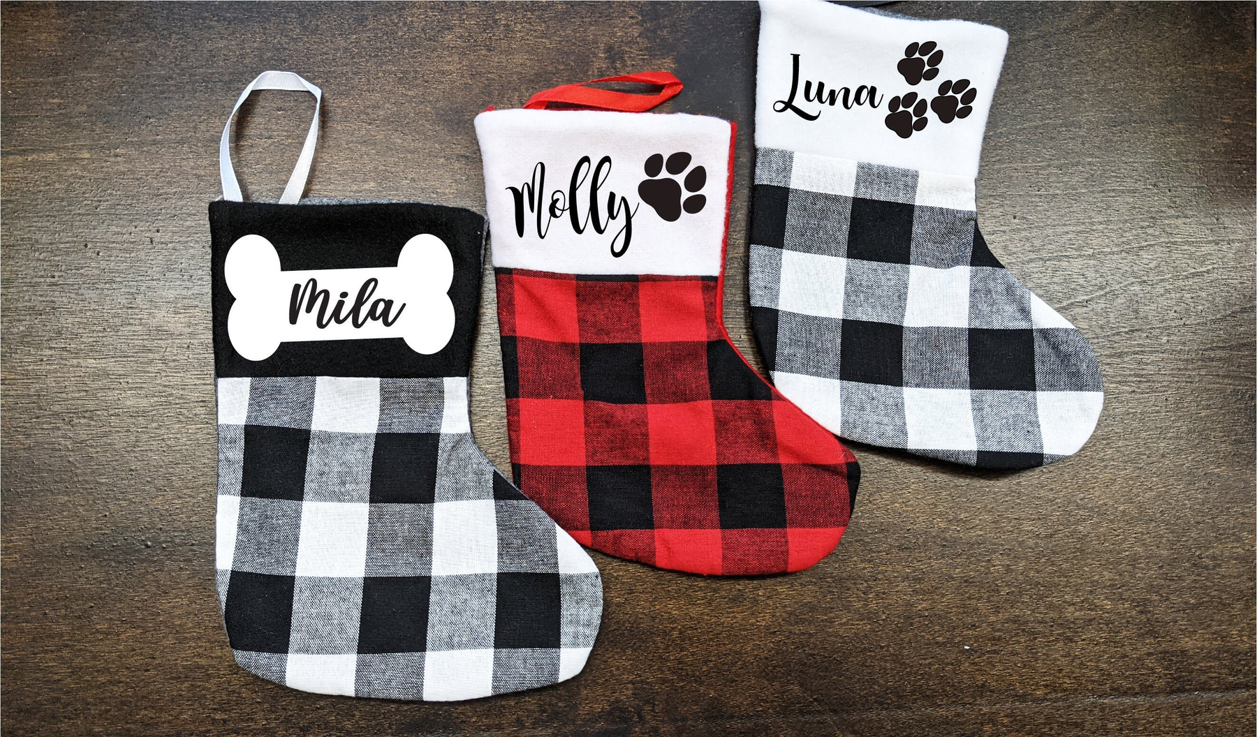 Celebrate the festive season with our Personalized pet Christmas Stockings with paw/bone Small Dog Christmas stockings Mini Cat stockings Custom pet Mini small Holiday stockings. Designed for pet lovers, these charming stockings are the perfect way to include your furry friends in holiday traditions. Crafted from soft fleece with a classic black and white buffalo plaid design, each stocking is a delightful addition to your holiday decor.