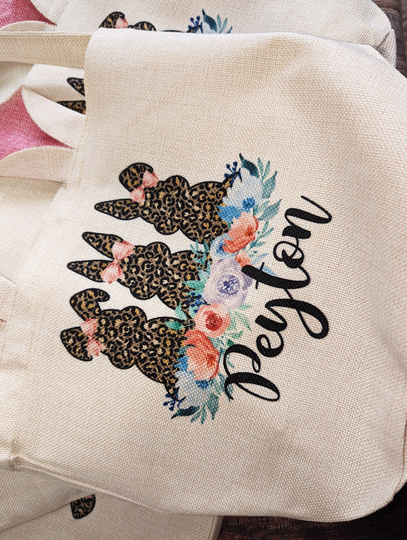 Introducing our charming Easter Basket| Personalized kids Easter bunny Egg hunt Bags | Leopard bunny Easter Bags with kid name, designed to make your child's Easter celebration even more special! These delightful bags are perfect for gathering eggs during the hunt and can be personalized with your child’s name, ensuring they stand out at every event.