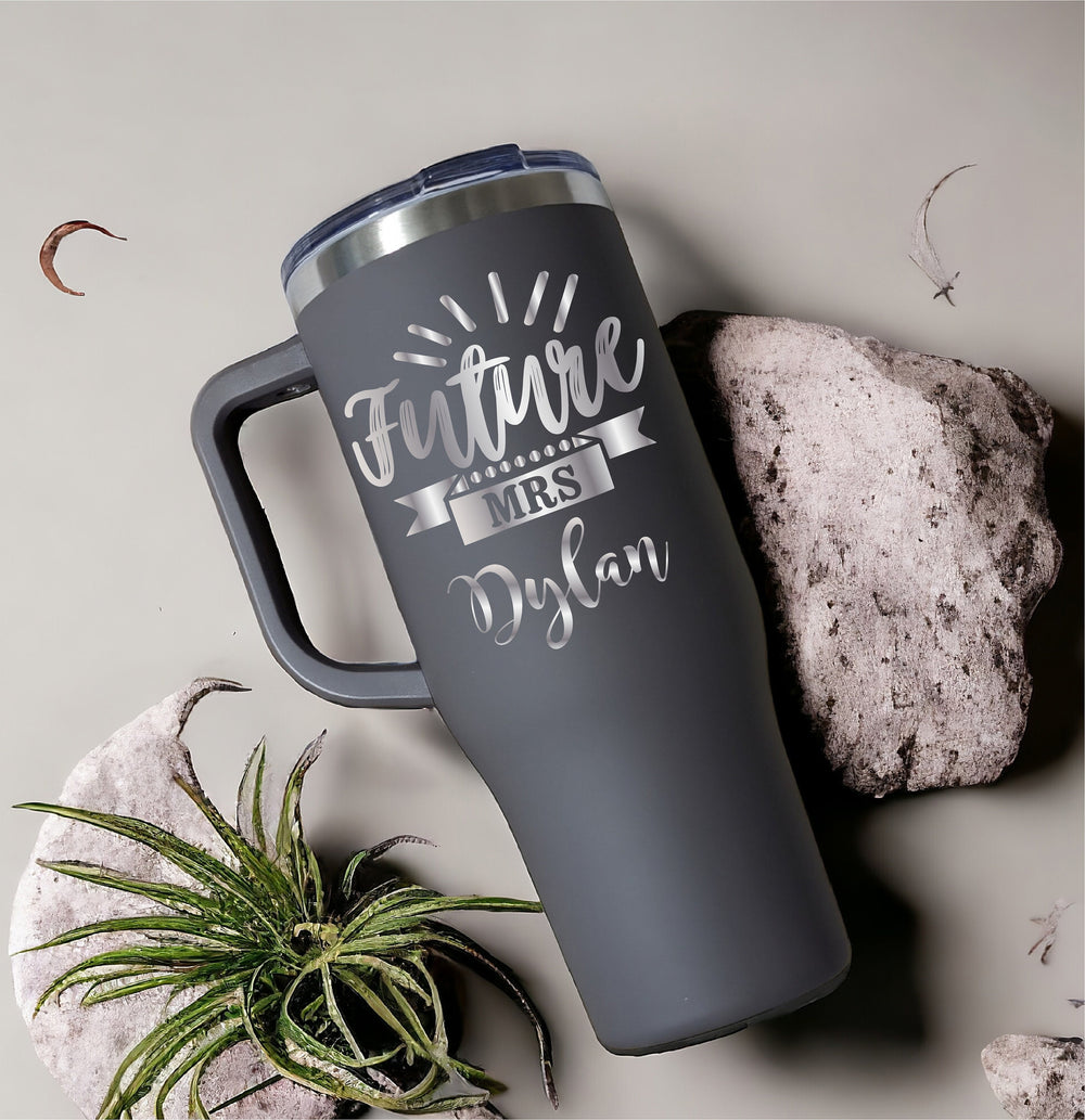 Introducing the Future Mrs stainless steel Tumbler Personalized Gift for Future Mrs Bridal Shower Gift Engagement, a stylish and functional 40 oz tumbler with a handle, designed specifically for brides-to-be! This custom engraved tumbler is the perfect gift for a bridal shower or engagement celebration, ensuring that every sip is filled with excitement and joy as the big day approaches.