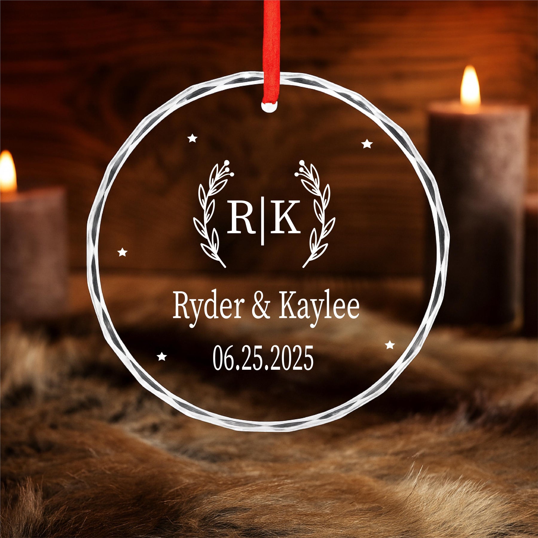 Celebrate your first Christmas as a married couple with this personalized laser-engraved glass ornament. Customizable with your initials, names, and wedding date, this elegant r keepsake makes a timeless addition to your tree or a heartfelt wedding gift.