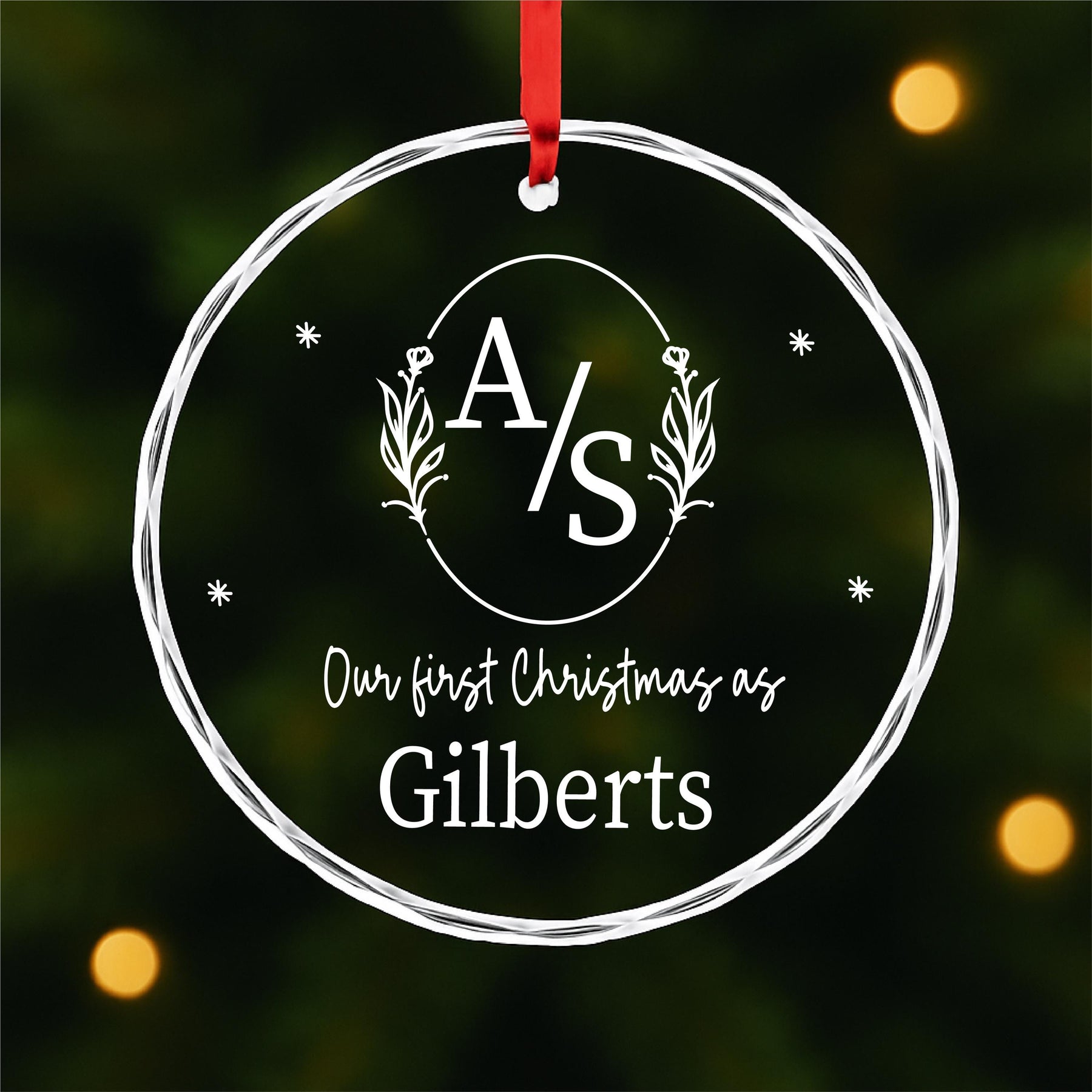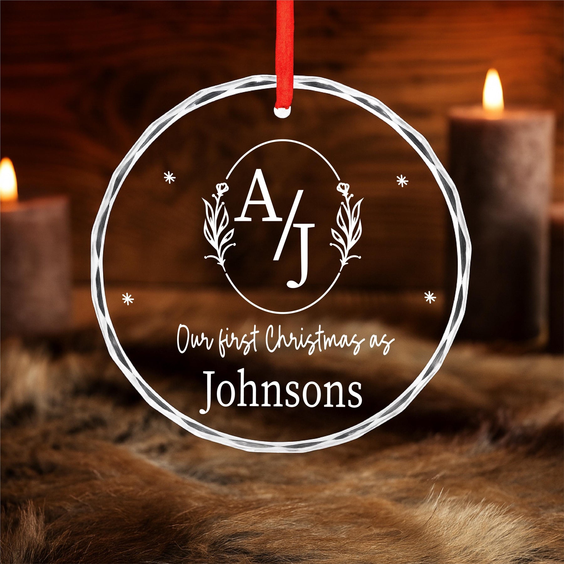Commemorate your first holiday together with this personalized laser-engraved glass ornament. Featuring your initials, last name, and elegant etched detailing, this ornament symbolizes love and togetherness. Ideal for newlyweds, engaged couples, or anniversaries.