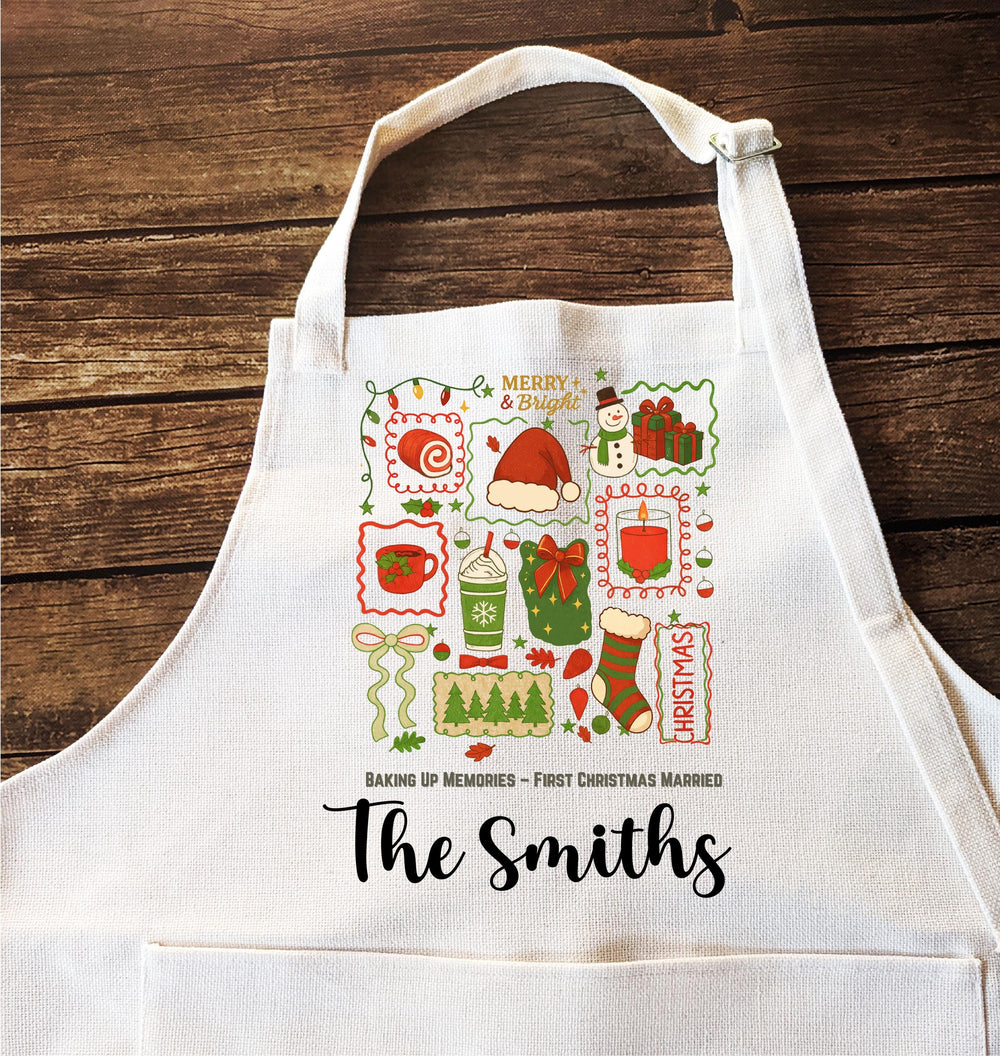 Personalized First Christmas Married Apron Matching Newlywed Holiday Aprons | Custom Couple Baking Gift | Mr & Mrs Christmas Kitchen