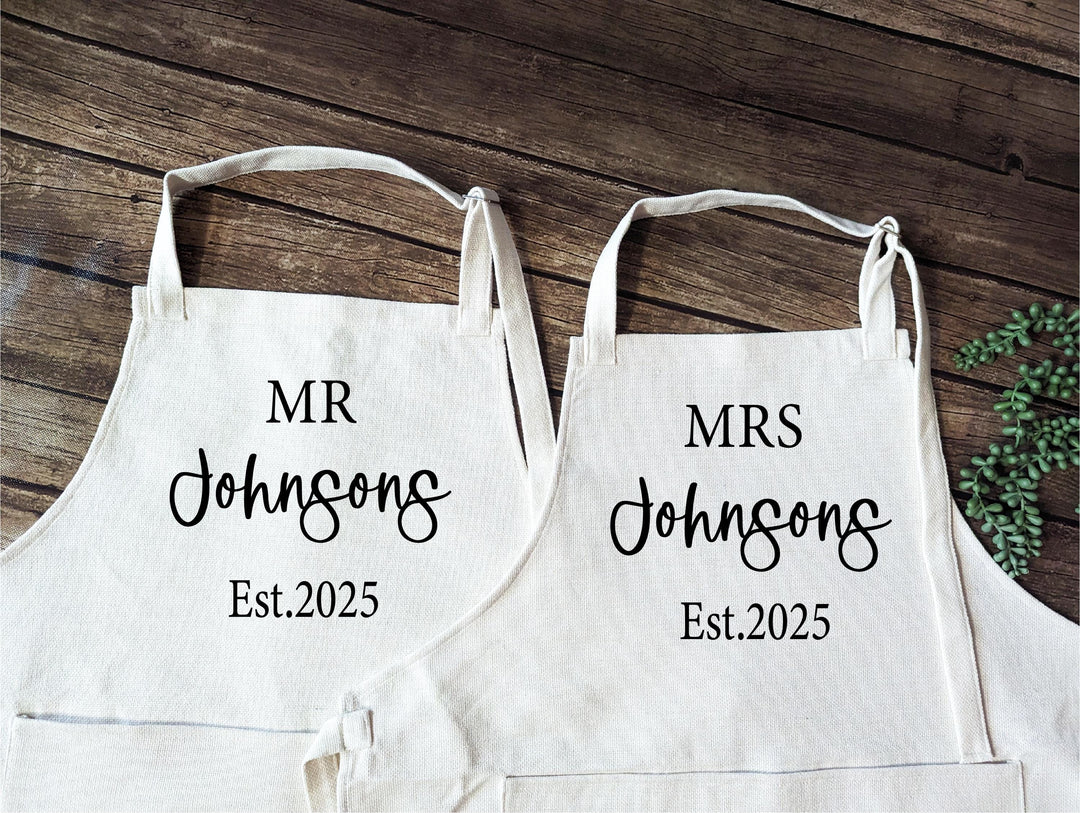 Personalized Mr & Mrs Apron Set – Custom Couple Aprons with Last Name and Est. Year, Wedding, Anniversary, or Bridal Shower Gift