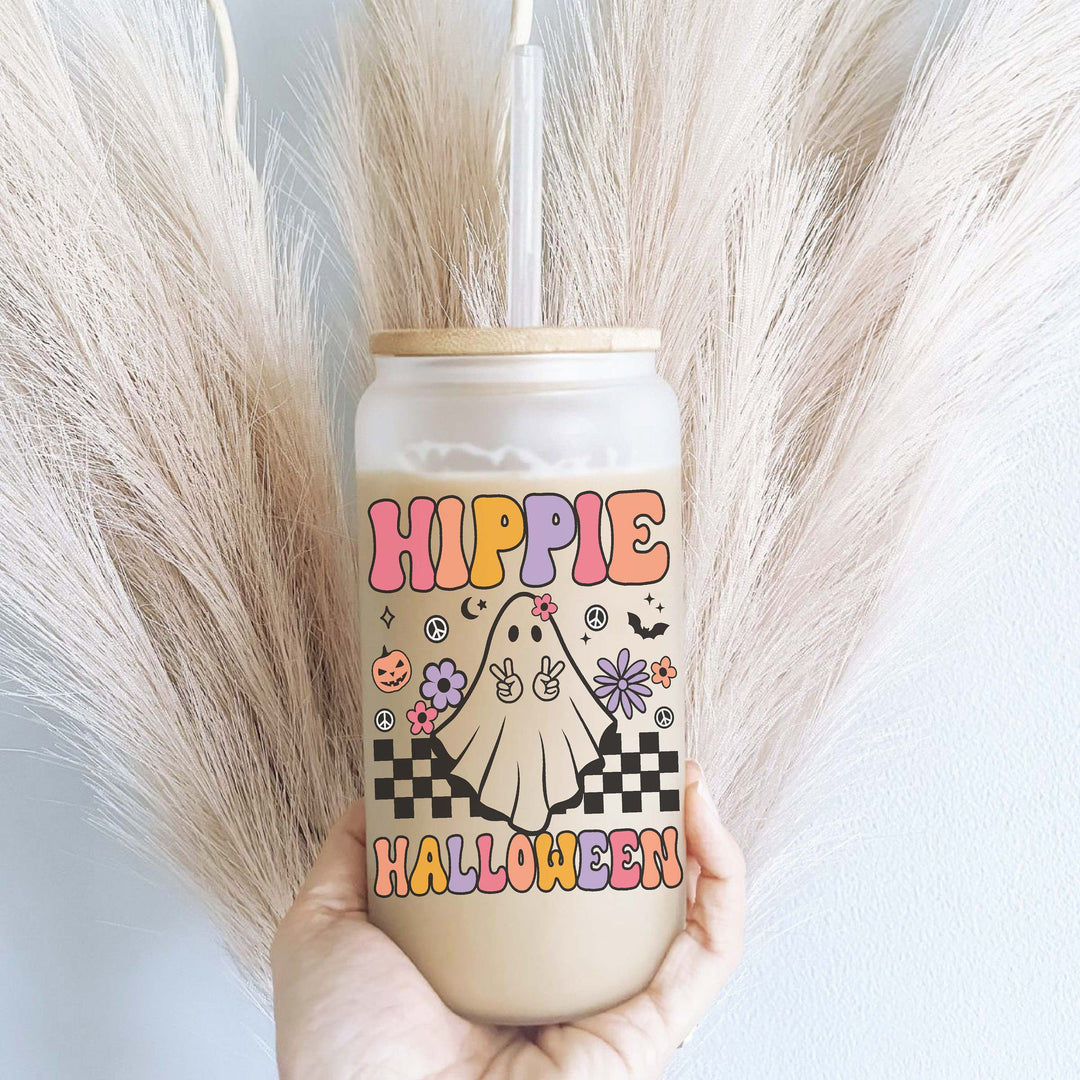Halloween Cups Spooky Ghost Glass Tumbler with Lid Straw