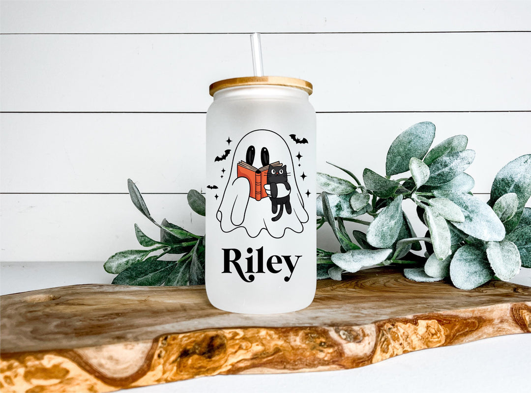 Personalized Halloween Glass Can with Ghost & Cat | Custom Name Iced Coffee Cup | Cute Spooky Gift | Frosted Tumbler with Bamboo Lid