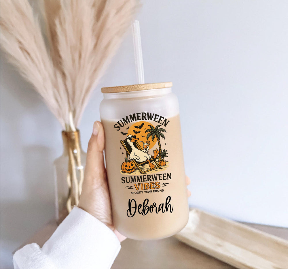 Summerween Glass Can Cup – Spooky Summer Vibes Tumbler, Frosted Halloween Beach Glass, Skeleton Tropical Drink Cup with Bamboo Lid Halloween