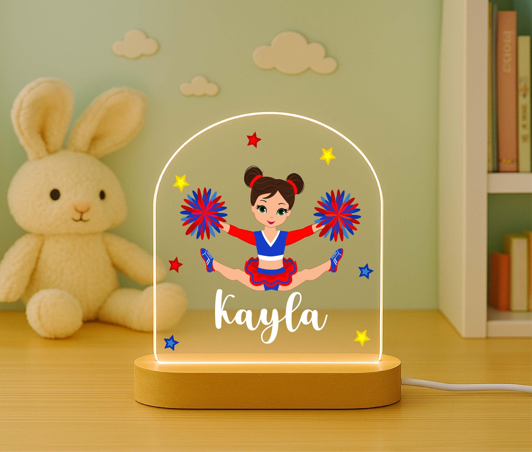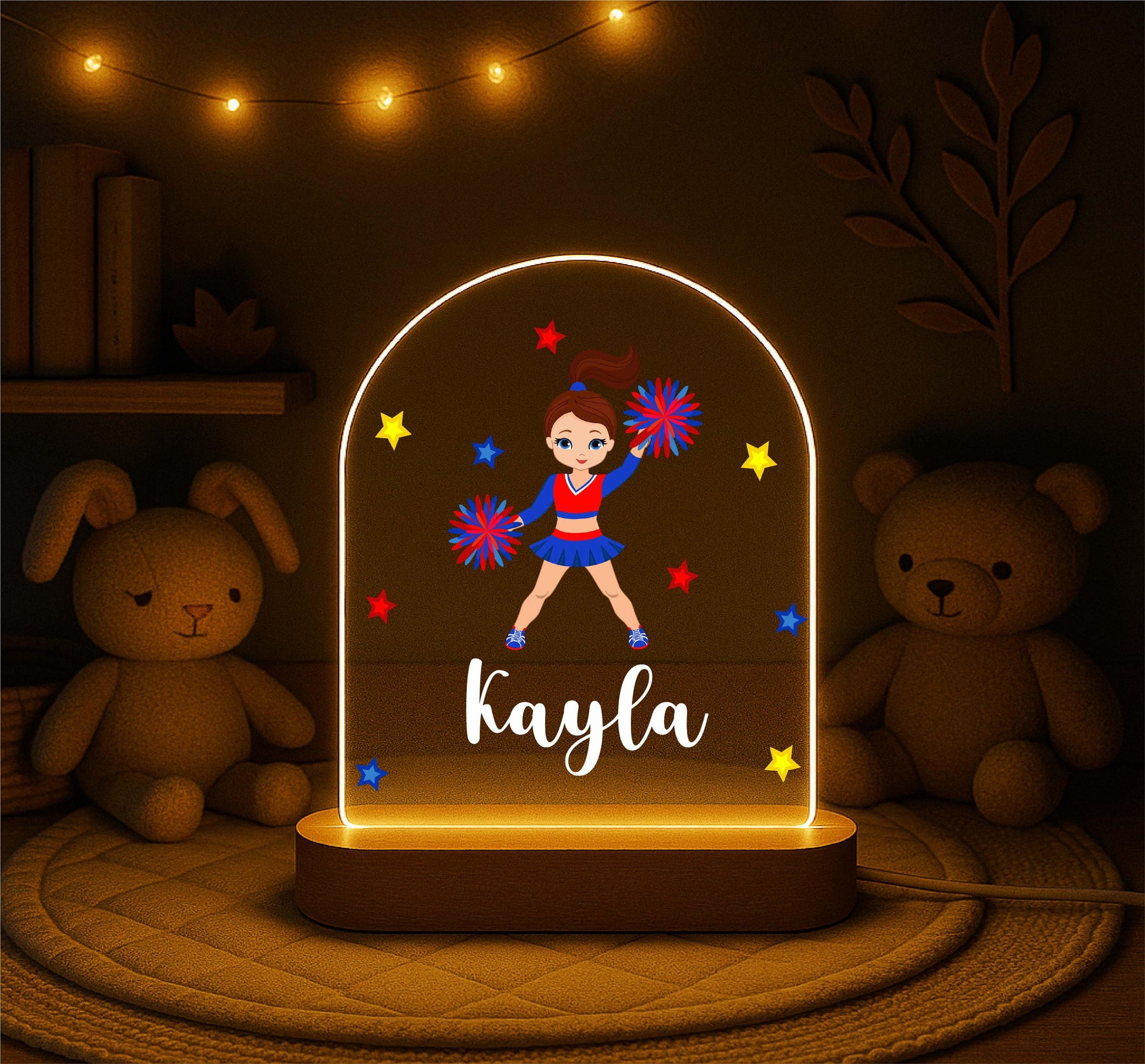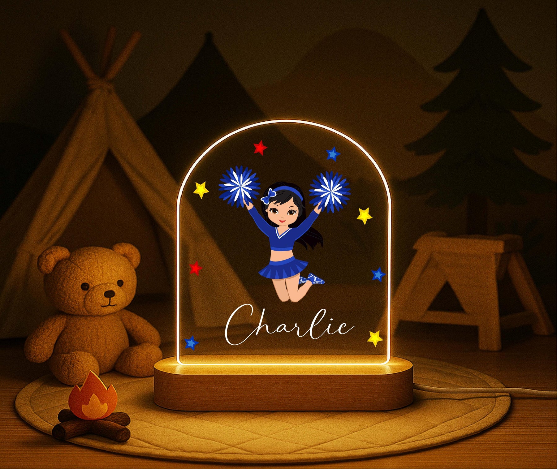 Personalized Cheerleader Night Light for Girls – Custom Name LED Lamp with Wooden Base, Cheer Team Gift, Girls Room Decor