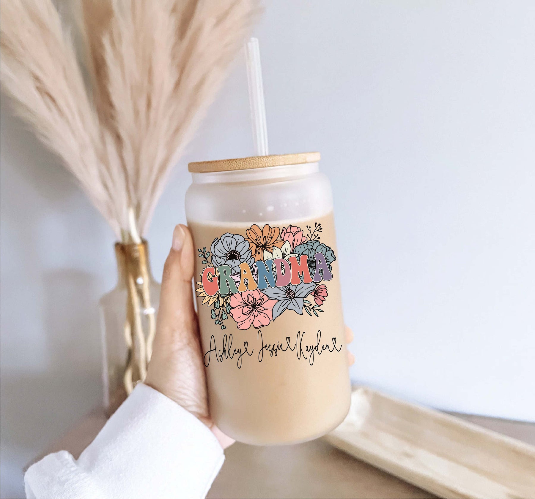 Introducing our Personalized nana Iced coffee Glass cup with lid and straw Custom Grandma coffee cup with kids name Gigi coffee cups Mimi personalized cups, the perfect gift for beloved grandmothers who cherish their iced coffee moments! This beautifully crafted 16oz glass cup combines style and functionality to elevate any beverage experience. Whether it’s a refreshing iced coffee on a warm day or a delightful homemade lemonade, this cup is designed to impress.
