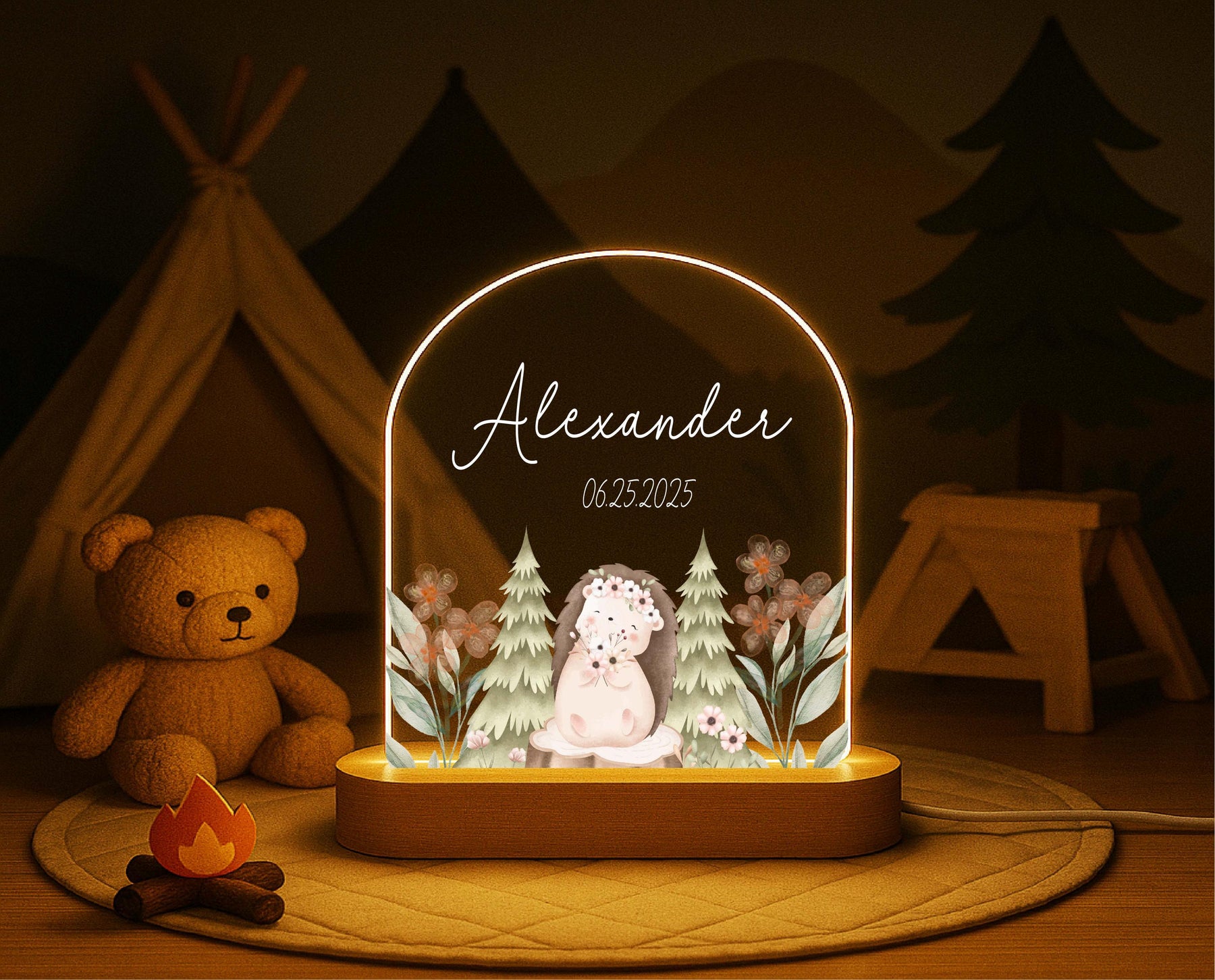 Woodland Animal Night Light – Personalized Hedgehog LED Lamp, Custom Name Baby Gift, Nursery Decor, Baptism or Birthday Keepsake