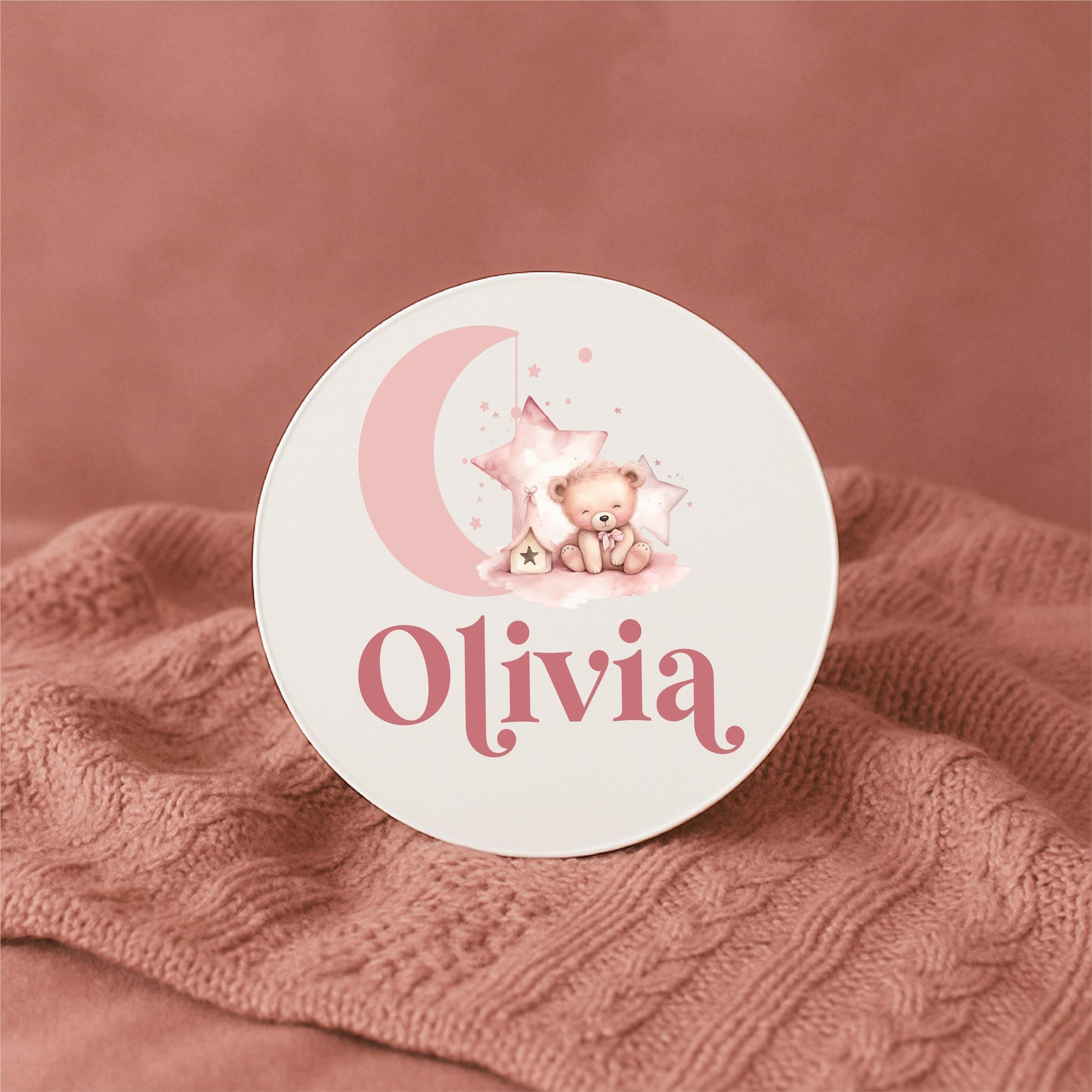 Celebrate your baby's arrival with this charming personalized acrylic name sign. Featuring a soft pink design with a moon, stars, and a cuddly teddy bear, it’s perfect for nursery decor, baby showers, or birth photo props. Customize with your baby girl's name to create a keepsake that lasts a lifetime. Ideal for newborn room styling or as a thoughtful gift for new parents.