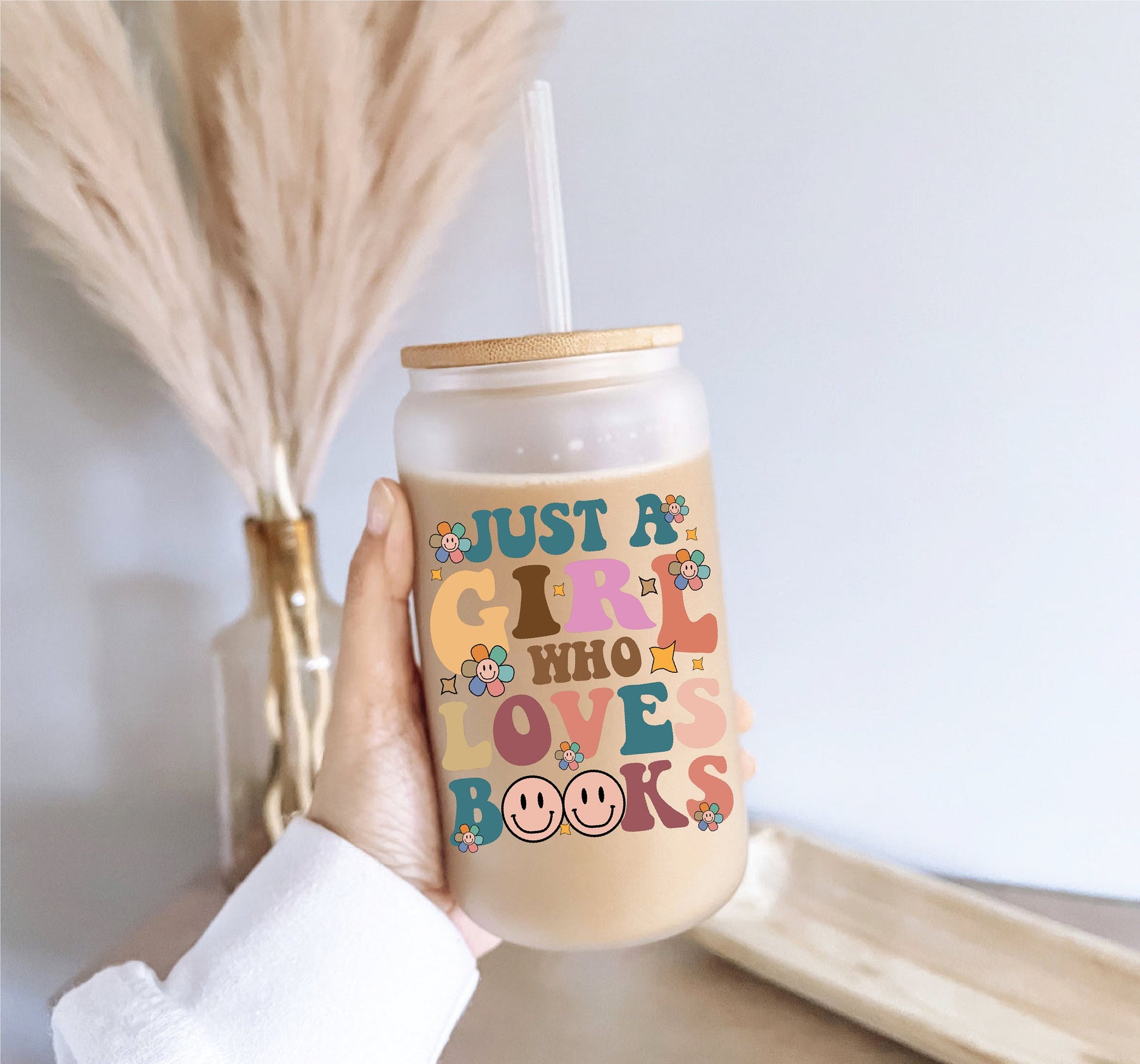 Elevate your beverage experience with the Just a girl loves books Iced coffee glass with lid and straw. It's not just a cup; it's a lifestyle statement for those who adore reading and enjoying their favorite drinks!