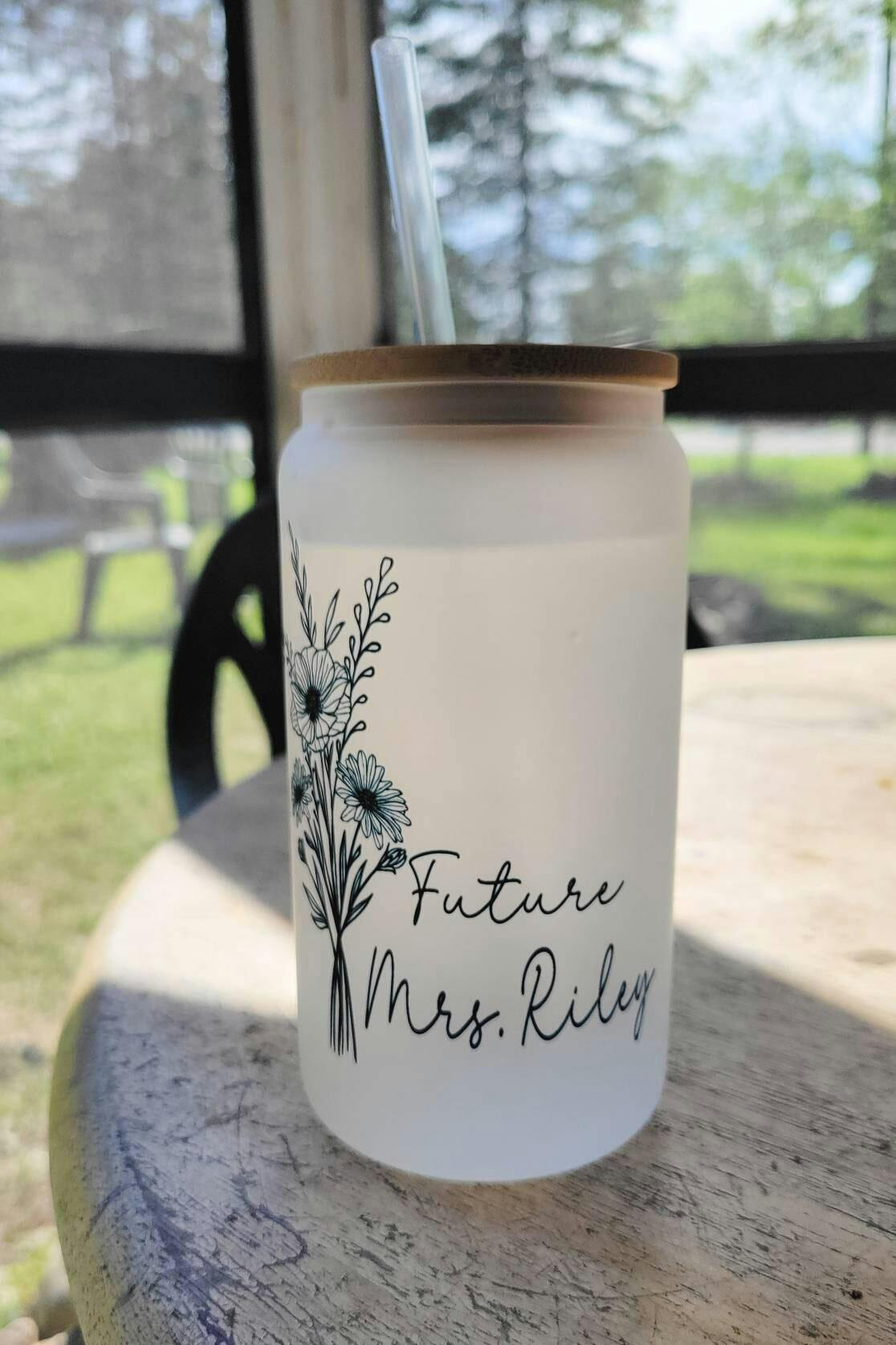 Introducing our Personalized future Mrs iced coffee cup Lid & straw Bridal shower gift Engaged tumbler Gift for Fiancée Custom name Future mrs coffee cups, the perfect gift to celebrate the upcoming nuptials! Whether you're preparing for a bachelorette party or seeking a thoughtful bridesmaid proposal, this stunning 16oz glass cup is both stylish and functional. Its durable glass construction and elegant design make it an eye-catching addition to any drinkware collection.