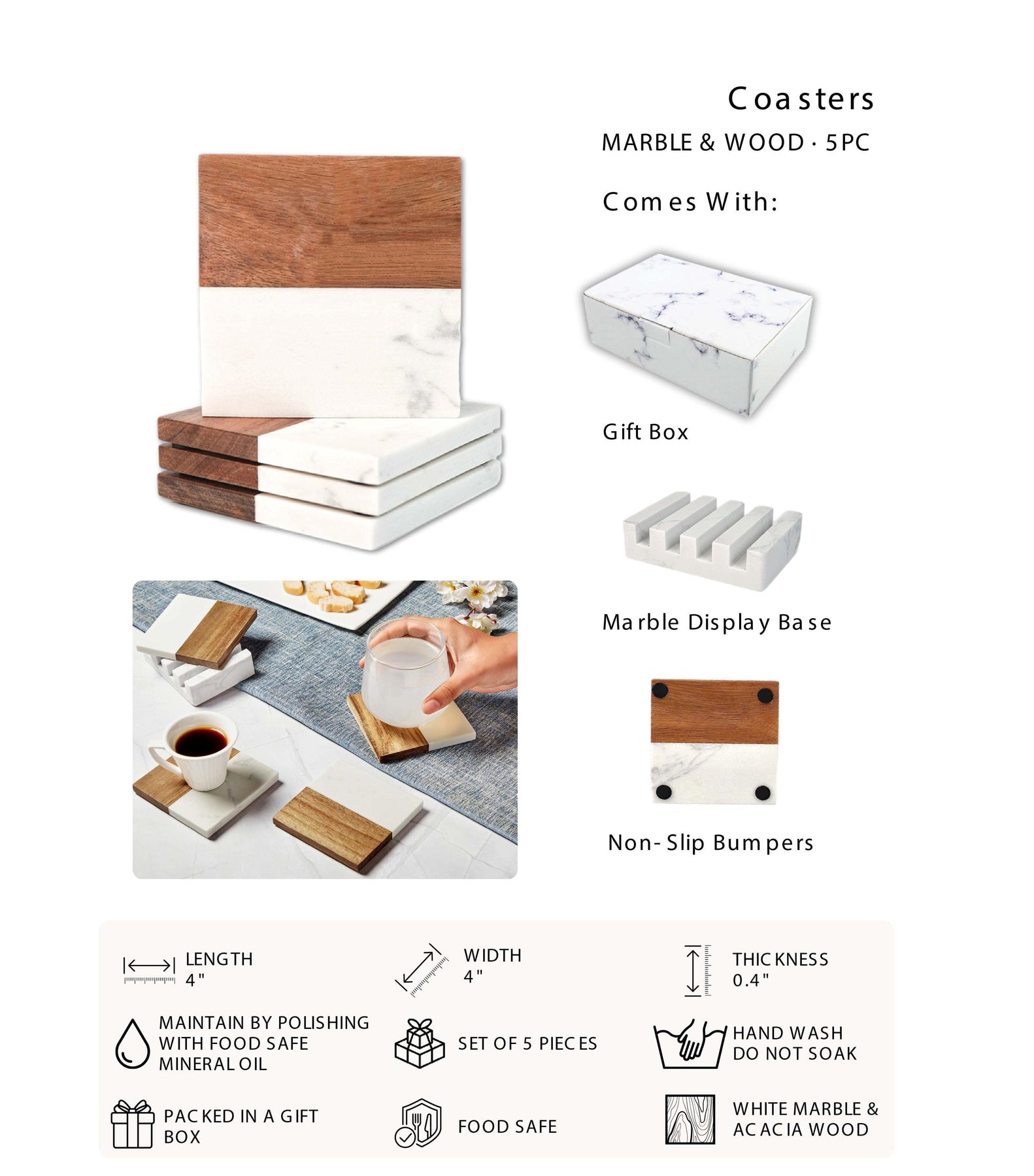 Material: White marble (top half ) + Natural acacia wood (bottom half)
