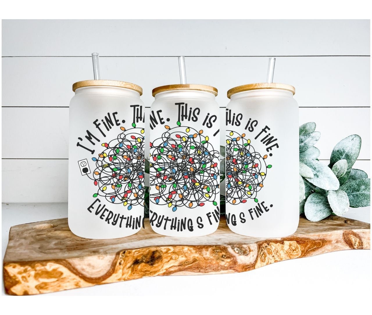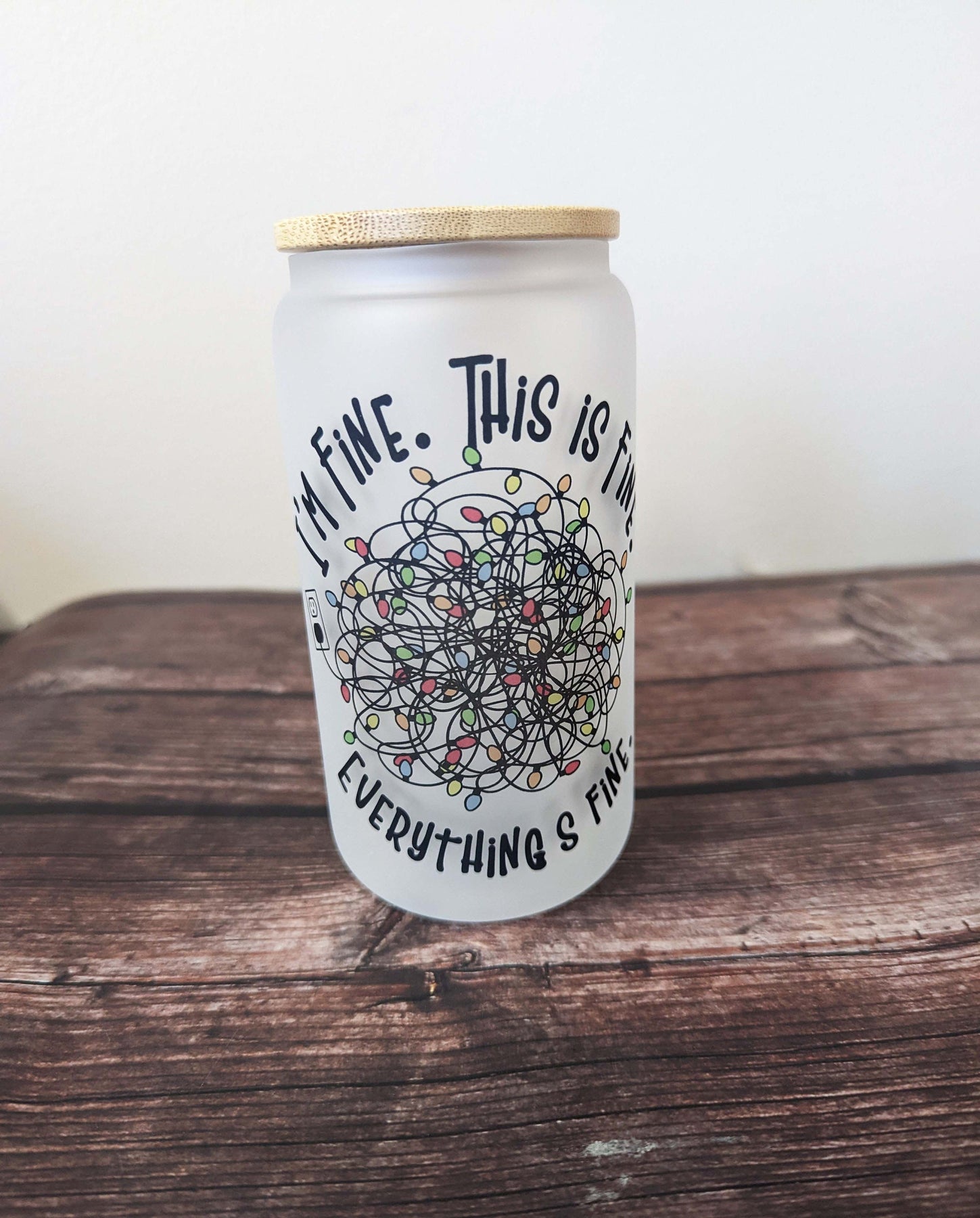 Funny Christmas Glass Can Tumbler with Bamboo Lid & Straw | Frosted Holiday Cup with Tangled Lights Design | Sarcastic Gift for Coworkers