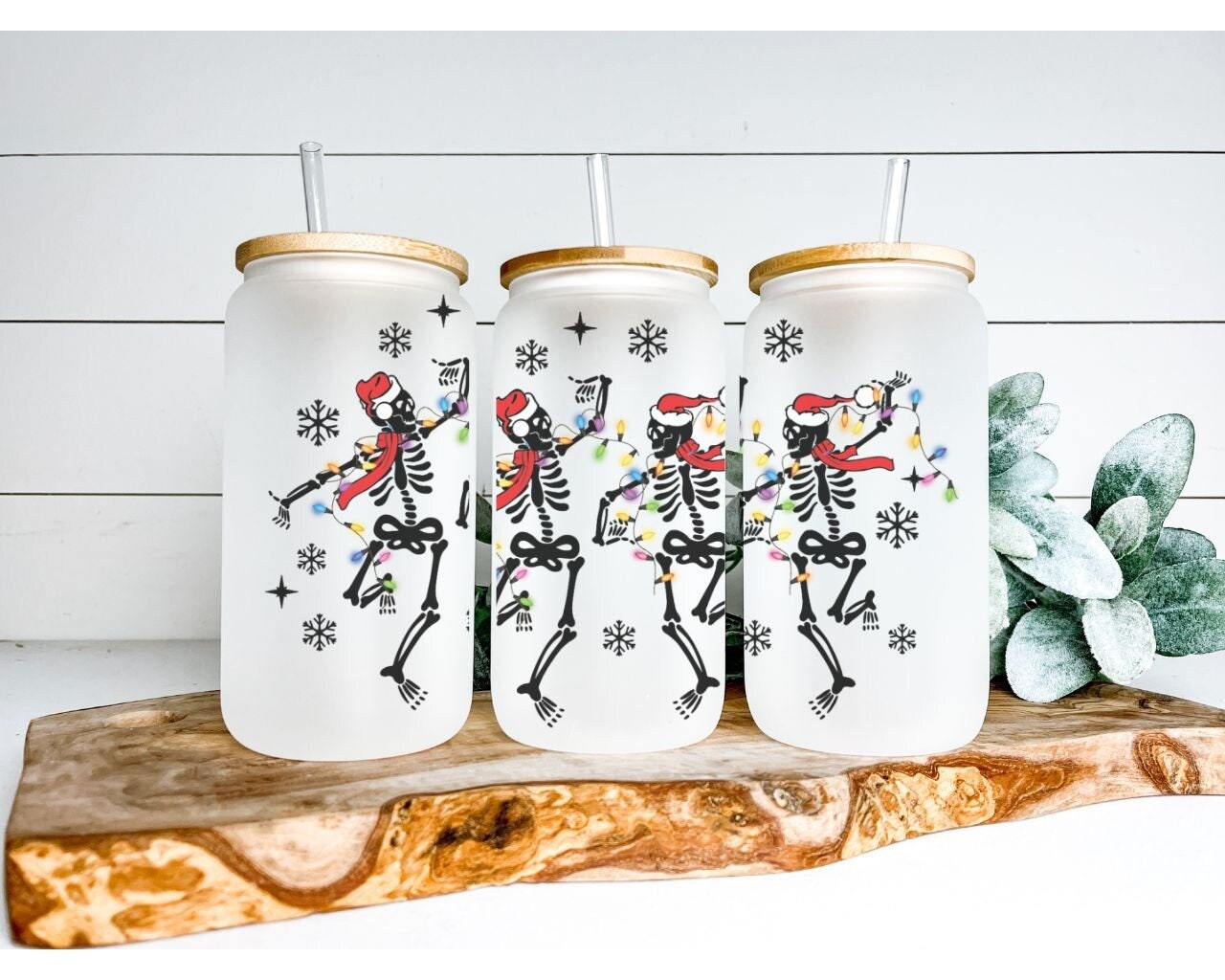 Skeleton Christmas Glass Can – Frosted Holiday Tumbler with Santa Hat & Lights, Funny Spooky Christmas Gift for Friends Parties