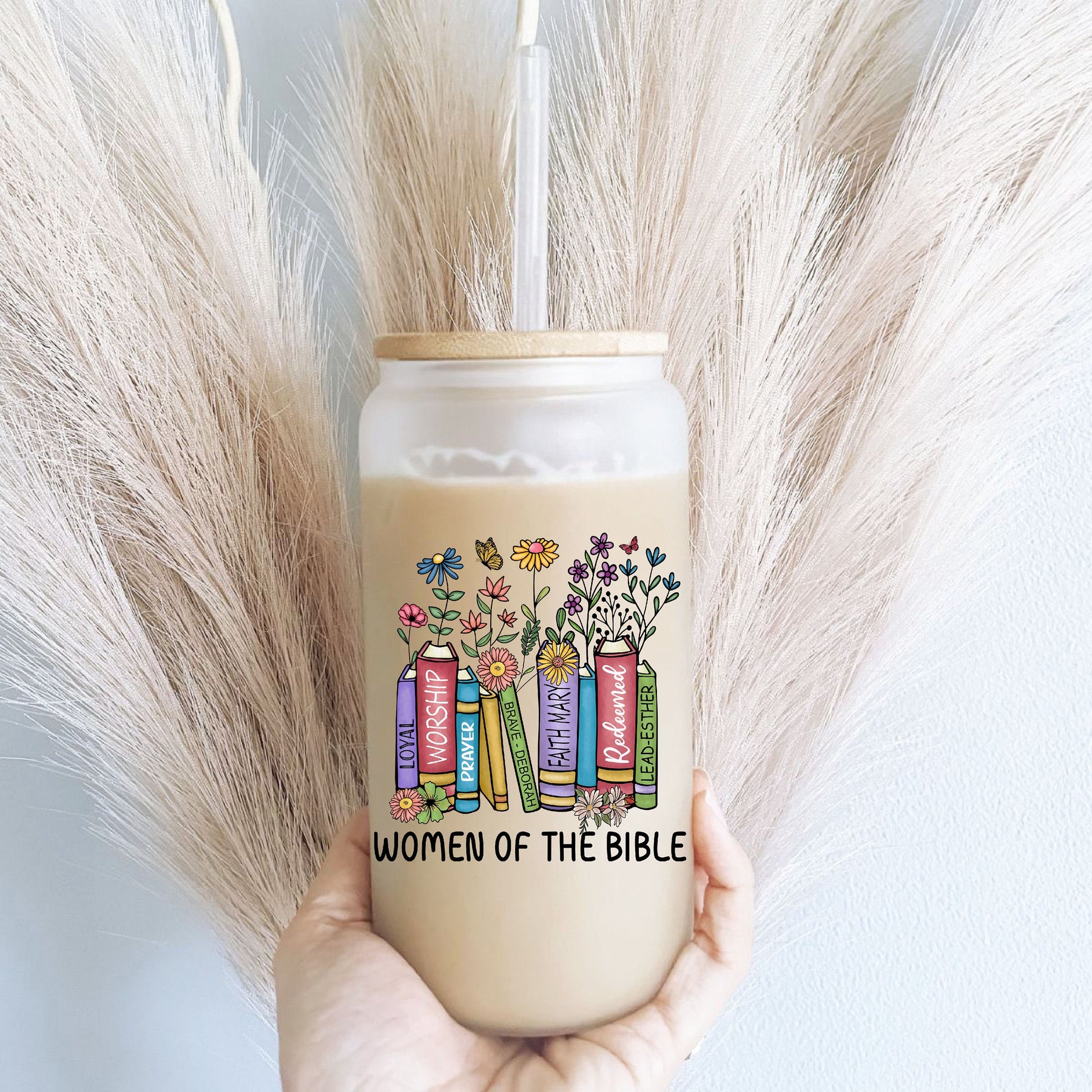 Introducing the women of the bible Iced coffee Glass cup with lid and straw, a perfect blend of functionality and inspiration. This beautifully crafted 16oz glass tumbler is not just a beverage container; it's a meaningful gift for anyone who cherishes their faith. The ideal Praying mom gift cups celebrate both style and spirituality, making it a wonderful choice for Christian coffee cup lovers and an excellent addition to any kitchen.