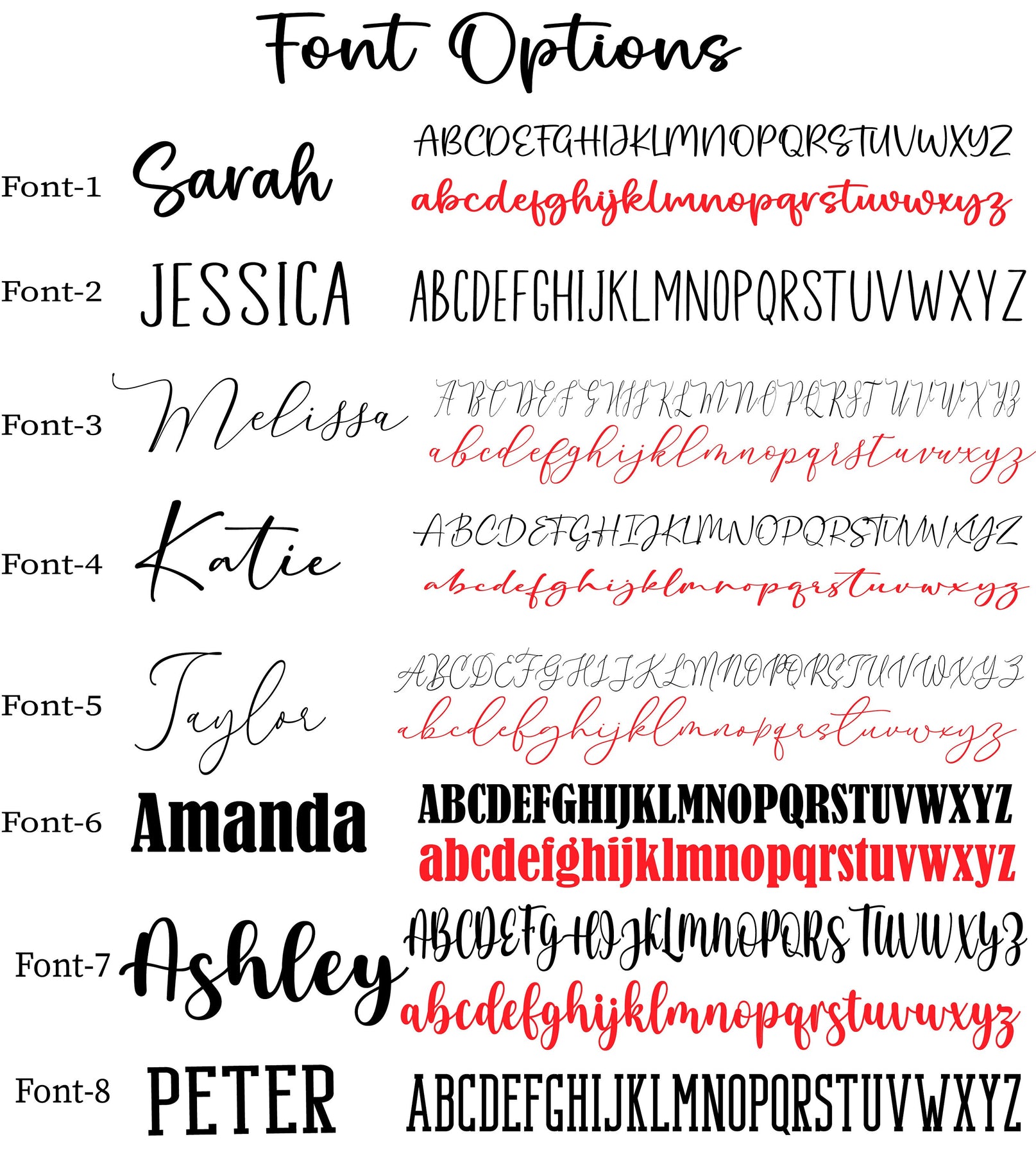 When ordering, please provide the font and name for personalization. If no specific font is indicated, we will default to Font 1.